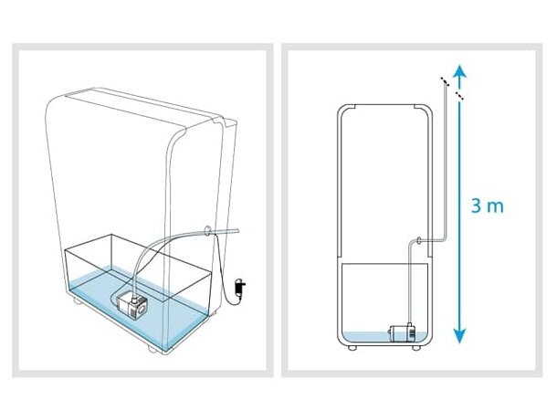 Denne lille pumpen plasseres inne i vannbeholderen til avfukteren, og gjør det mulig å pumpe vannet ut til et avløp, selv om avløpet ligger høyere enn avfukteren.