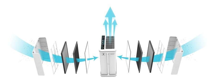 Maskinen leveres med to forfiltre, to HEPA-filtre, to kullfiltre, to fotokatalytiske filtre, to UV-lamper samt ionisering og aerOHeal® rensesystem som uskadeliggjør virus og bakterier. Luftrenseren baserer seg på rensing med HEPA-filter, en velkjent og effektiv teknologi. Den leveres med HEPA-11 som standard, men du kan oppgradere til HEPA-13 neste gang du bytter filter. Luftrenseren har enorm viftekapasitet og suger inn luft fra begge sider (foran og bak).