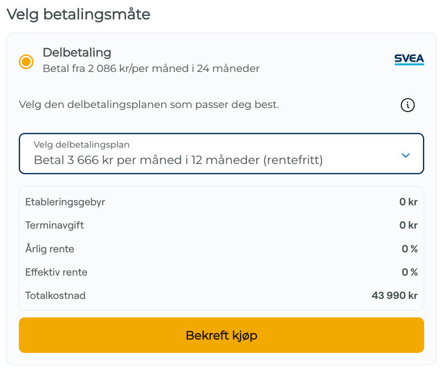 - Velg Delbetaling 12mnd u/kostnad (se under)