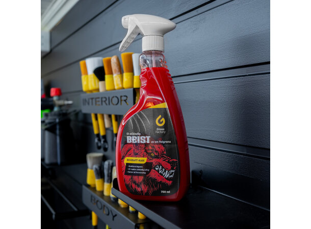Gloss Factory Beist Felgrens er en felgrens på nedre del av pH skalaen. Dvs. en meget kraftig felgrens som vil løse de fleste utfordringer du har på felgene. Enten det er fastbrent bremsestøv, sot som har satt seg skikkelig godt fast eller organisk søle og skitt som sitter hardt fast. Gloss Factory BEIST felgrens er løsningen når du står fast.