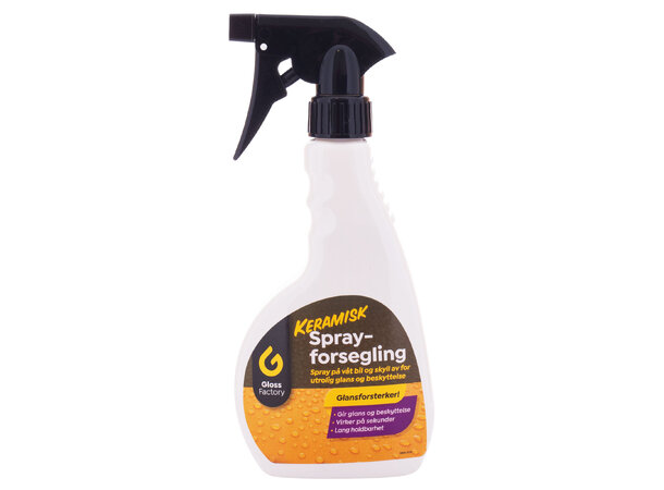 Gloss Factory Keramisk Sprayforsegling er en enkel i bruk og gir opptil 4-5 måneder varighet ut av en påføring. Keramisk Sprayforsegling vil gi lakken på bilen din en super hydrofobisk effekt slik som vi kjenner igjen fra teflon stekepanner. Vann og skitt vil rett ikke feste seg like godt i lakken som også resulterer i enklere vask.