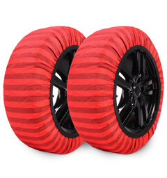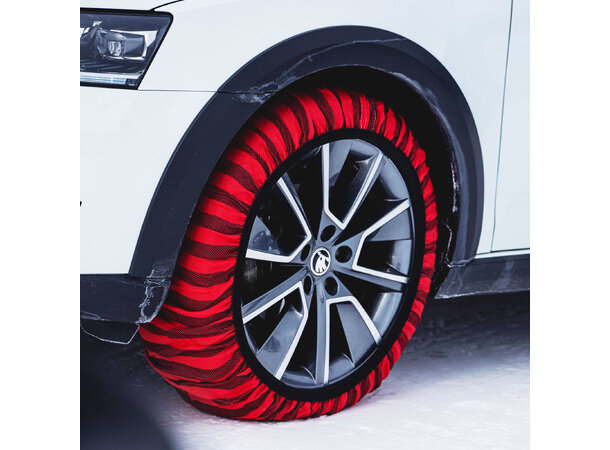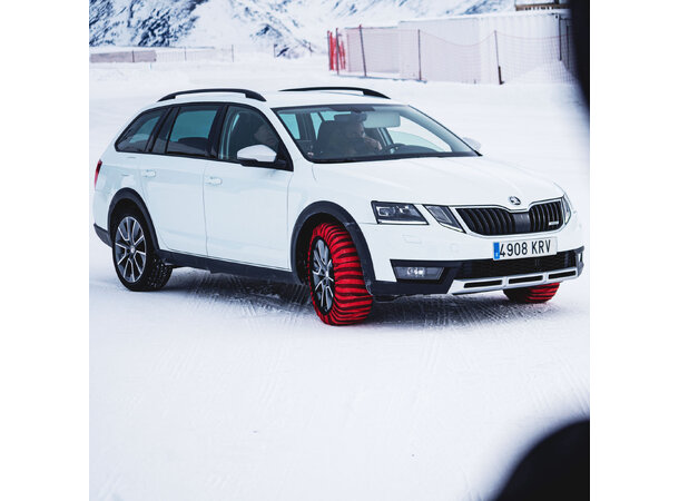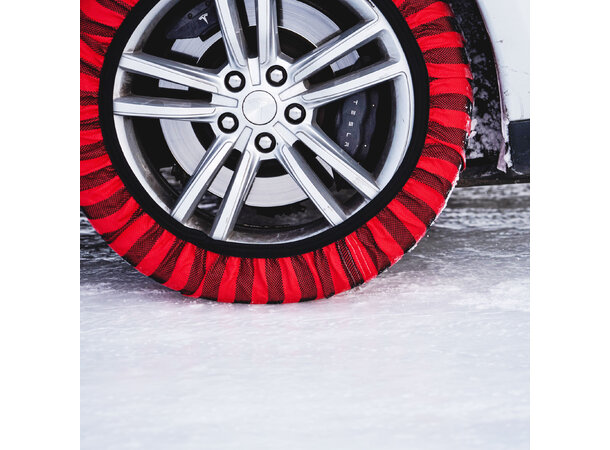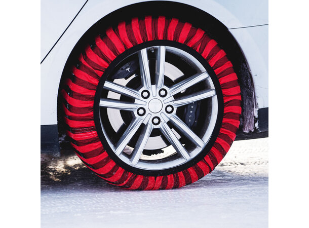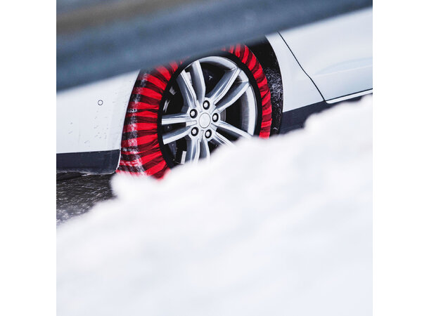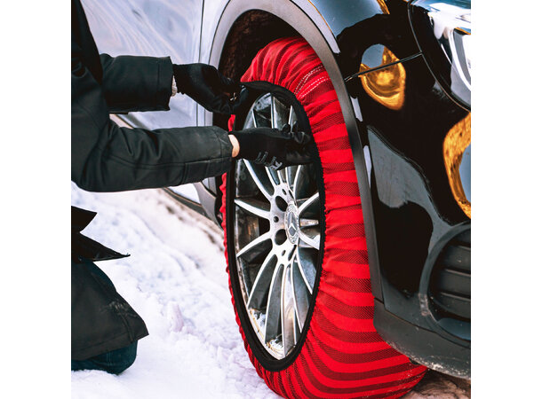 - Tekstilkjettinger er laget for midlertidig bruk og bør kun brukes på snø eller isdekte veier. Unngå kjøring på tørt underlag for å unngå skade på sokkene.