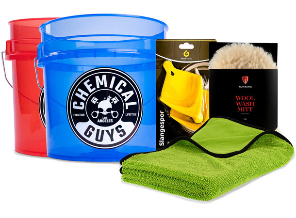 Her har vi satt sammen en utstryspakke til bilvask med våre favoritter for en god, skånsom bilvask. Vi har tatt med 2 bøtter, slik at du kan vaske skånsomt med 2-bøtte systemet. Dessuten følger her våre 2 favoritter; Vaskehanske og Tørkehåndkle fra Turisimi, som garanterer deg en skånsom vask og tørk av bilen din.