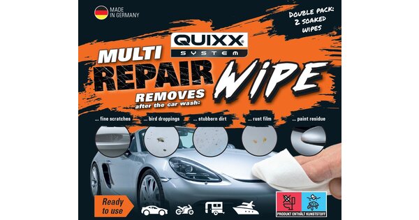 QUIXX Multi Repair Wipe er klar til bruk og fjerner etsemerker og små riper i lakken på bilen, bobilen, campingvognen eller motorsykkelen enkelt med kun én wipe. Multi Repair Wipe fra Quixx tar lite plass og er helt genial å ha med i bilen, motorsykkelen, campingvogna eller i båten.
