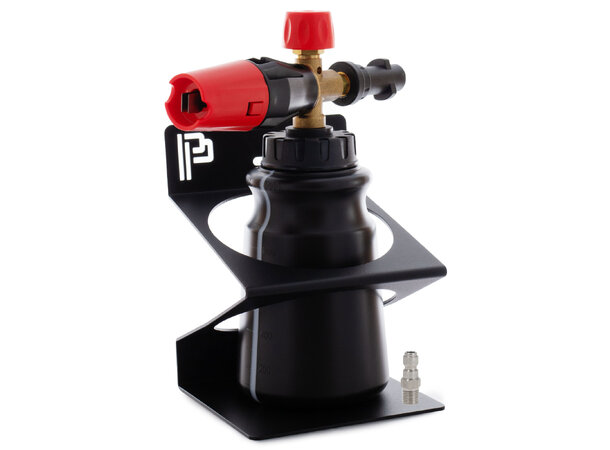 Turisimo Foam Cannon Deluxe inkludert en meget solid holder for skumkanonen, for montering på vegg. Veggholderen fra Poka Premium har meget høy kvalitet med 1,5mm galvanisert stål og pulverlakkert, dette sikre at produktet holder seg pent over lang tid.